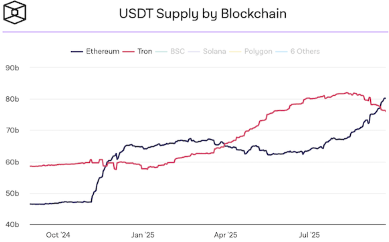 Ethereum has overtaken Tron as the leading network for USDT supply, climbing back to $80B after trailing earlier in 2025. While both chains have maintained stable ranges around $75–80B, Ethereum’s resurgence reflects user preference for its mature DeFi ecosystem and institutional-grade infrastructure over Tron's lower fees. Daily USDT transfers on Ethereum now approach 1M, underscoring its role in payments and settlements as traditional finance increasingly adopts stablecoin rails. With institutions like PayPal embracing Ethereum-based stablecoins, the network appears poised to strengthen its position as the primary settlement layer for global stablecoin flows.