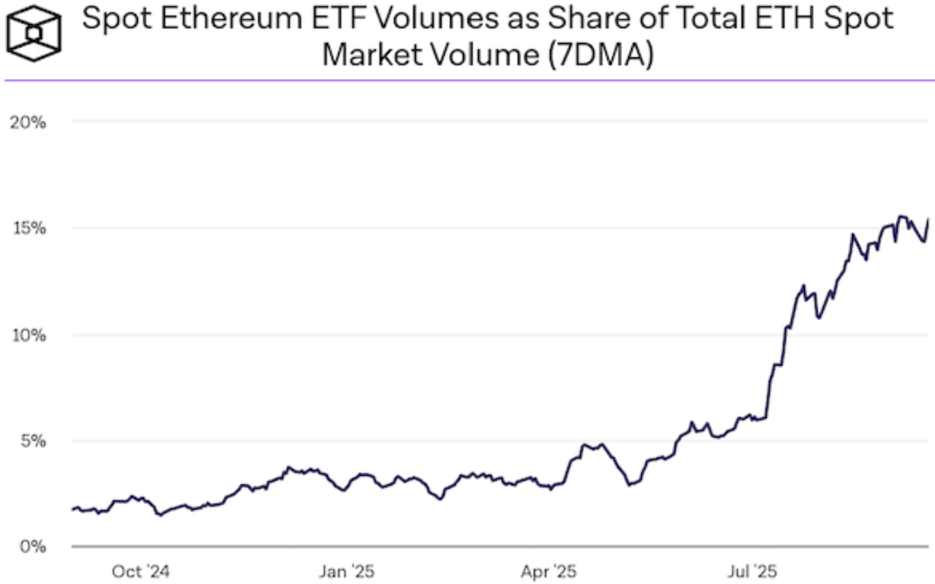Spot Ethereum ETFs now account for 15% of ETH spot market volume, up from just 3% at launch in late 2024, signaling rising demand for regulated exposure over direct token ownership. This shift has fueled ETH’s 30% YTD rally to ~$4,500, but also concentrates large amounts of ETH in ETF custodians rather than decentralized wallets. While ETFs broaden access and institutionalize Ethereum investment, they risk sidelining DeFi activity unless providers win approval to stake their holdings for yield. The trend points to ETFs becoming a dominant force in ETH markets, balancing mainstream adoption with Ethereum’s decentralized ethos.