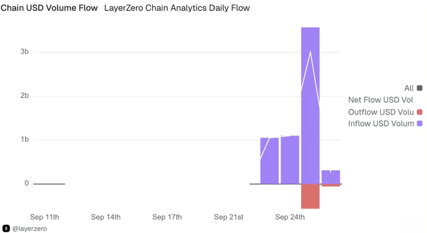 Plasma, a Tether-backed stablecoin-focused L1, launched Sept. 25 with LayerZero’s OFT + Stargate bridge stack and immediately drew ~$3.5B in inflows, helping LayerZero hit a $4.6B ATH in daily volume. Since Sept. 23, Plasma has seen ~$6.03B in inflows against just ~$0.62B in outflows, netting ~$5.41B—about 8.6% of all LayerZero USD inflows—across 9K+ wallets and 17 active OFTs. With 100+ DeFi integrations at launch, including Aave, Ethena, Binance Earn, Maple, and Plume × Nest, Plasma is already emerging as a leading hub for stablecoin liquidity, institutional credit products, and yield-bearing assets.